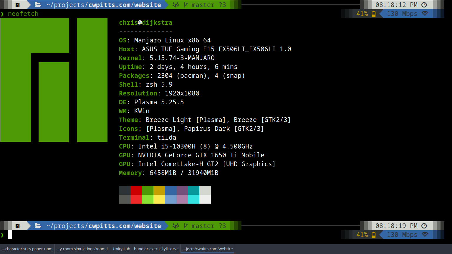 One of the problems with doing machine learning and artificial intelligence at home for fun is that you need hardware. Specifically, you need storage space for data, and memory for computation. At the moment, the easiest way to get a system that has plenty of storage and memory is to purchase a laptop designed for gaming. When I was looking for a new laptop last year, I settled on an ASUS TUF gaming laptop with 2TB of storage (1TB SSD, 1TB HDD), and 32 GB of RAM. Plenty! Here’s the neofetch: